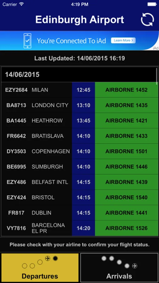 Displays current 'Departures' and 'Arrivals' at Edinburgh Airport (EDI)