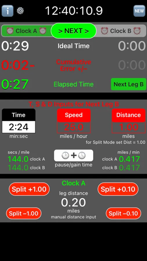 In the special situation where the Distance = 1.00, the app will change its functionality to the "Split mode" where you can incrementally add or subtract distances of 1.0 or 0.1 miles or kilometers. Many rally teams monitor progress along the rally course this way. By manually incrementing the distance each mile elapsed since the start of a leg, for example, the Ideal Time and the Cumulative Error will increment simultaneously.