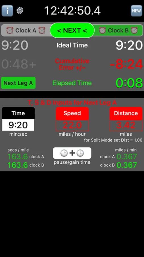 This app allows you to compute the ideal time to cover a particular distance at a particular speed, to add that time to one of two clocks A or B, and then to toggle between the clocks for each leg of the rally while recording the cumulative error as you go.