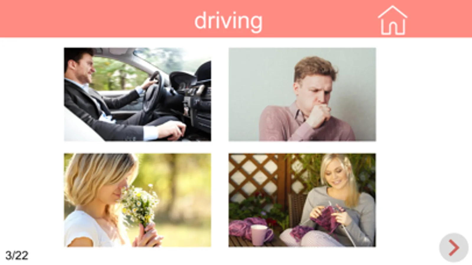 Read: In this activity, the person is required to read and understand the written verb and match it to the corresponding picture. There is a choice of 2, 3, 4 or 6 pictures.