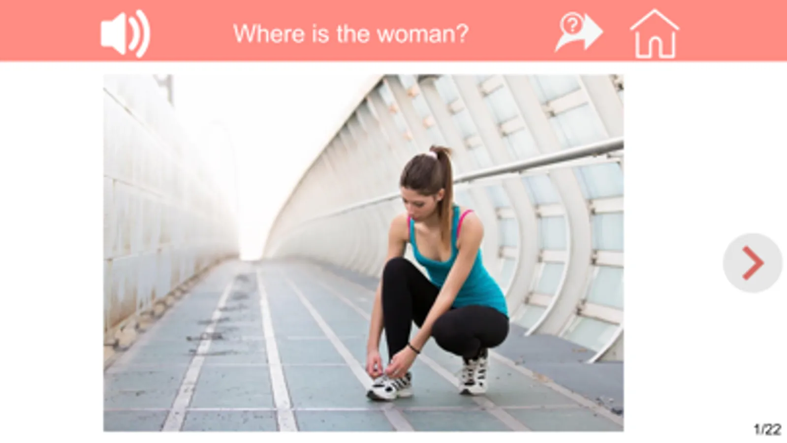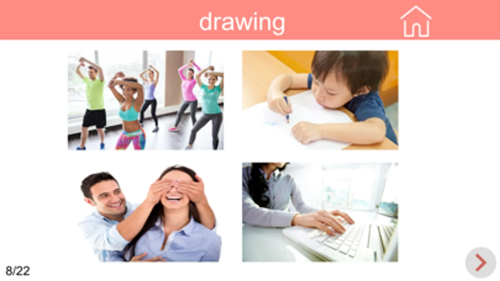Listen: In the activity, the person is required to understand the spoken verb and match it to the corresponding picture. There is a choice of 2, 3, 4 or 6 pictures.