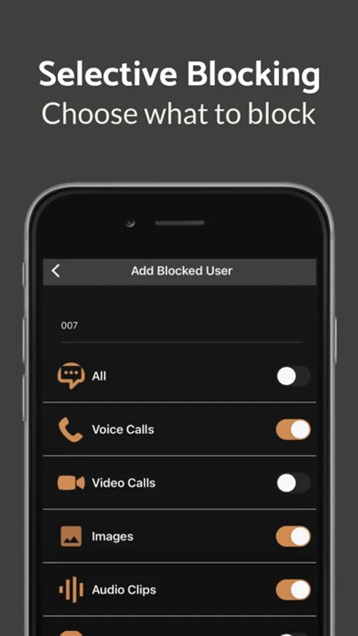 Should you wish to no longer receive a certain file type (voice message, images, documents, etc...) from a contact, you can simply choose to apply a partial block.
