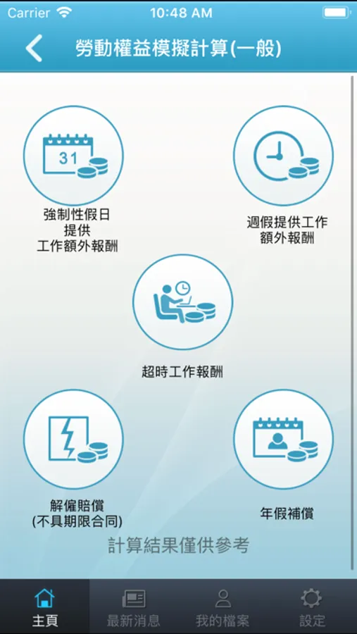 - 勞動權益模擬計算,輸入月薪等資料模擬計算「強制性假日提供工作額外報酬」、「週假提供工作額外報酬」、「解僱賠償(不具期限合同)」及「年假補償」;