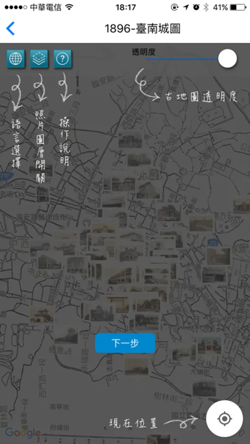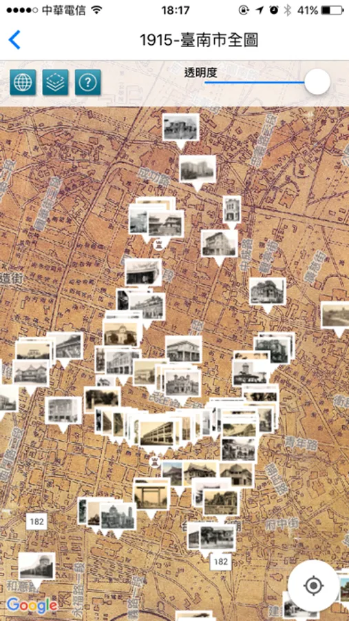 The Tainan Historical Maps gathers old maps and photos published between 1875 and 1978 and compares them to Google Maps and Street View. When a device's mobile positioning function is added in, users can compare the old and new maps and photos as they walk around, allowing them to "travel in time" and relive the elegance of old Tainan. Eleven different maps of Tainan's streets from different eras provided by the Academia Sinica Center for Geographic Information Systems (GIS) and the Research Center for Humanities and Social Sciences (RCHSS) show an area approximately within Tainan's city limits. It also contains 129 photos from the archives of the Academia Sinica Institute of Taiwan History, National Taiwan Library, and the National Taiwan University Library that include images of official buildings and street shops.