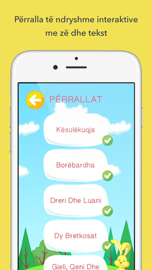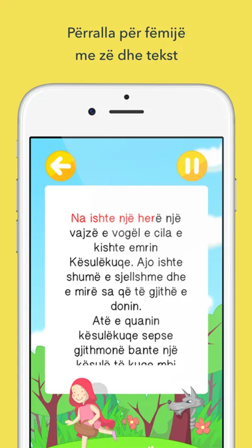 Përveç përrallave si Borëbardha, Dhelpra dhe Cjapi, Rosaku i Shëmtuar, etj aplikacioni përmban edhe vjersha të cilat përveç se janë me zë, iu mundësojnë fëmijëve që t’i mësojn ato shumë më lehtë sesa me metodat tradicionale. Disa prej vjershave përfshijnë titujt si: Dy shoqe, Voglushja Kianë, Gjyshi dhe Erëlindi, etj.