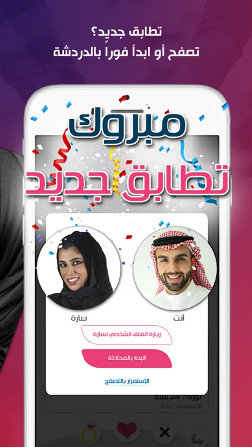 • مع بحث المستخدمين الآخرين ستتلقى تنبيهًا بكل تطابق جديد، لتتمكن من تصفح الملف الشخصي للمُطابق وتنتقل للمحادثة أو تكمل البحث والتصفح.