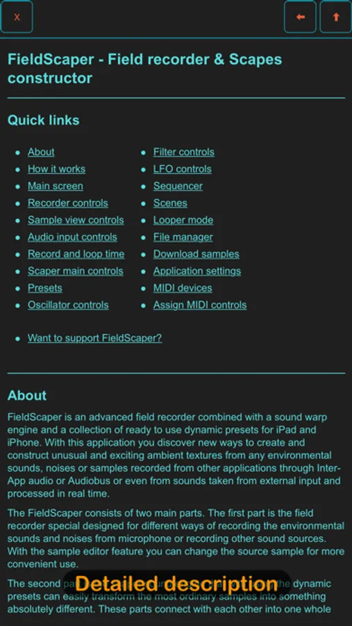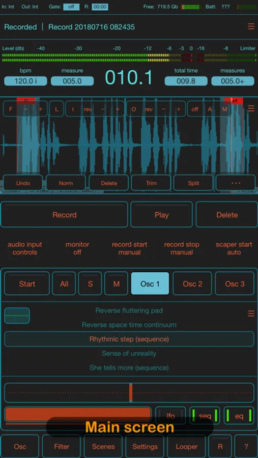 The FieldScaper supports complete MIDI control for all faders, knobs and many buttons. You can change the parameters of oscillators, filters, delays and mixer by using any external MIDI controller or MIDI apps like sequencers. With the MIDI controllers this app becomes very comfortable to use at live performance.