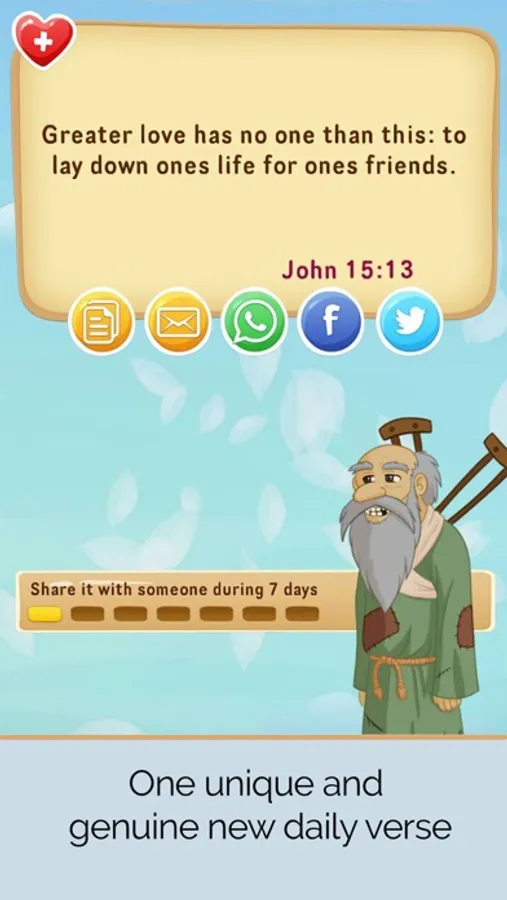 This is not a common Bible App (like the amazing Bible Gateway). We wanted to create a simple app where you can read a unique verse from the Bible and share it with your friends and relatives on your Social Networks, via SMS, Whatsapp or Email it.