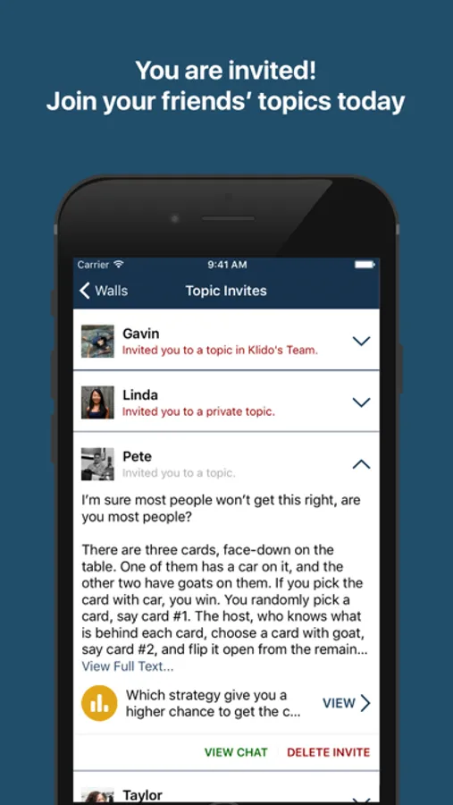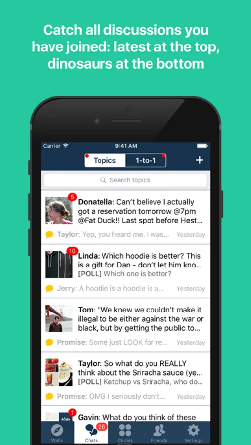 • Browse through all posts that are open to you and join as many as you like. All posts you have joined or created are shown in one place, so you can easily get back to the chat rooms, update or follow things you care, or search the chat history.