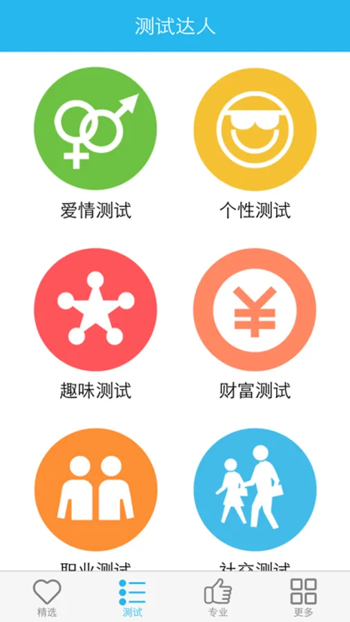 【测试区】测试区包括爱情测试,个性测试,趣味测试,财富测试,职业测试,社交测试,智商测试,综合测试八大模块。