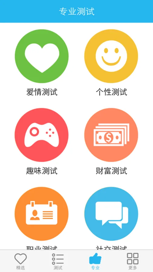 【专业区】专业区由心理老师为大家提供更加专业的测试,通过积分和跳转的方式一步步挖掘测试者的内在心理。专业区包括爱情测试,个性测试,趣味测试,财富测试,职业测试,社交测试,智商测试,综合测试八大模块。