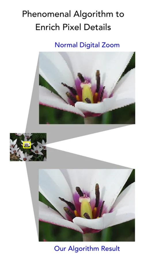 ◉ ZOOM - Zoom mode uses in-house single image technique to preserve image details after the image is rescaled. PrimeCam provides 2x, 3x, and 4x scale factor and typically it retains more details and sharper image than normal digital zoom.