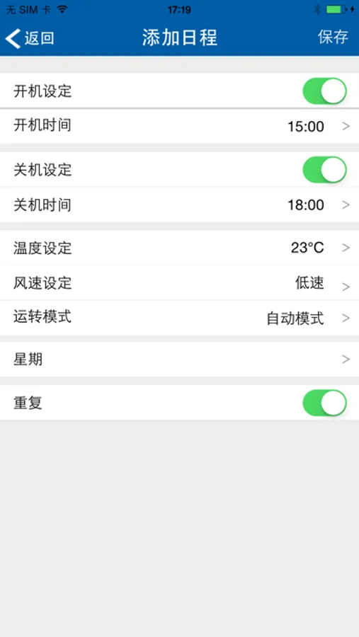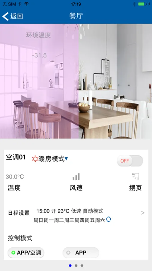 本应用可以控制三菱重工海尔的相应空调,有日程设置,温度调节,模式调节,风速调节,扇叶的摆动位置等一系列操作,完全代替了传统的遥控器等操作,还可以进行远程控制,为现代生活增添了一份新鲜和智能的气息,高科技其实离我们并不遥远。
