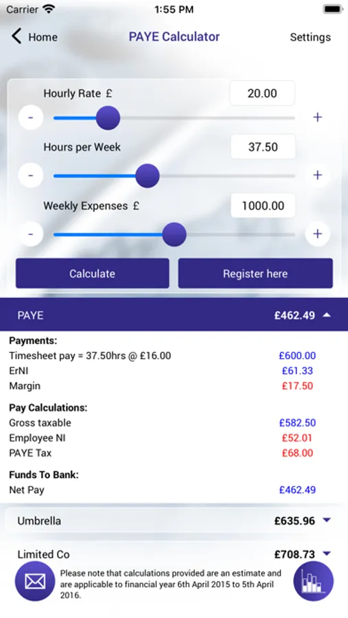 • Set your own tax code, tax letter and NI Number to get the closest estimate to your exact net pay.