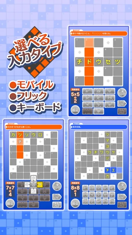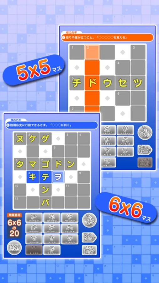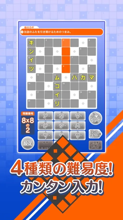 カギと呼ばれるヒントを元に、決められた文字数のキーワードを埋めていくパズルゲームです。