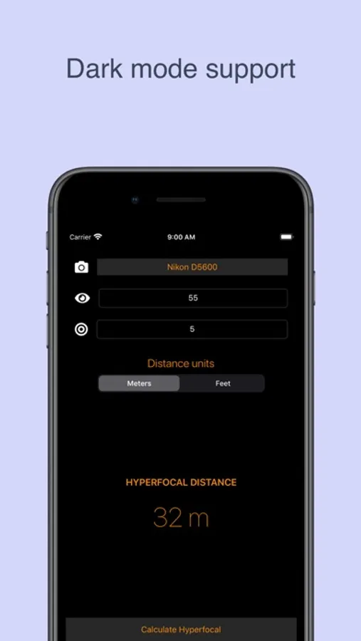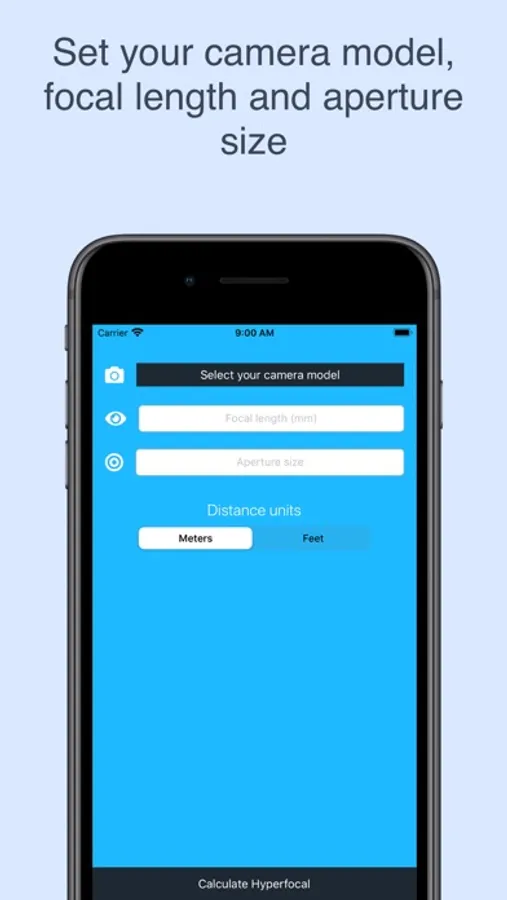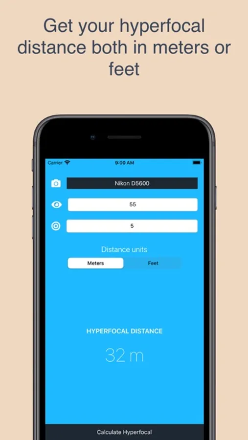 With this app, you can calculate hyperfocal distance in an easy way. Just pick your camera model from the list, set your focal length and aperture used, and click on "Calculate Hyperfocal". That's all!