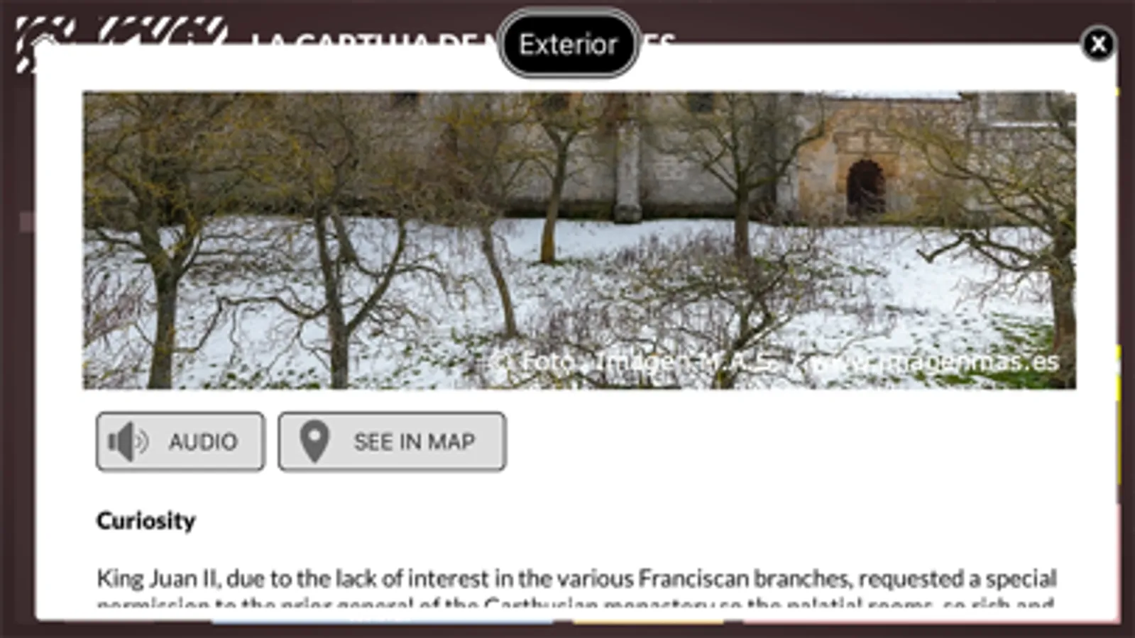 A handy guide and an audio app of the Cartuja of Miraflores in Burgos in a one device, your own phone!. Entertaining and intuitive, the only way to know each place and each chapel of the cartuja during your visit. You will also have a memory forever of what you've seen and it costs less than a cup of coffee.