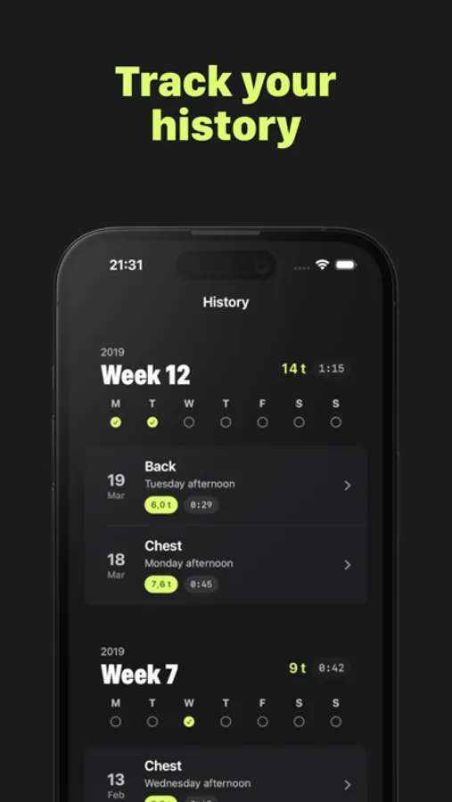 Between workouts (or during an ongoing workout) you can review your past performance by easily accessing your workout history.