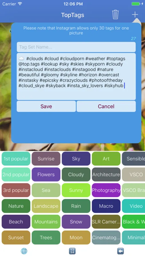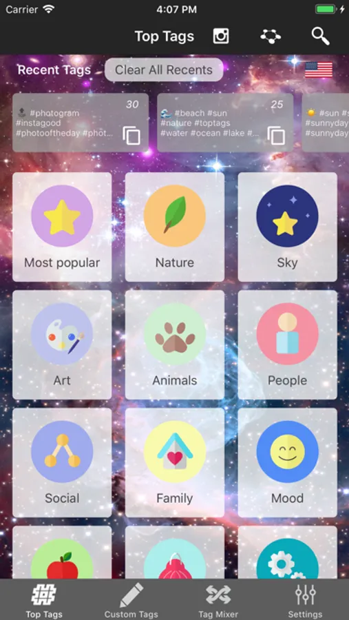 Use our app with predefined or custom hashtags to get featured on our Top Tags Instagram page (@top.tags)!