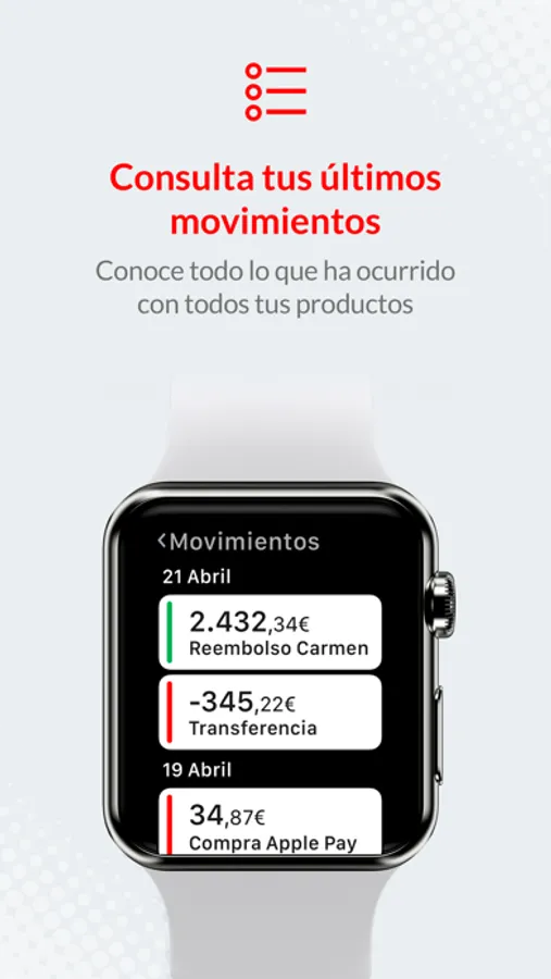 Consulta con sólo un vistazo a tu muñeca y forma rápida las variaciones que hay en tu día a día con tus cuentas y tarjetas. Además, visualiza las notificaciones desde tu Apple Watch.
