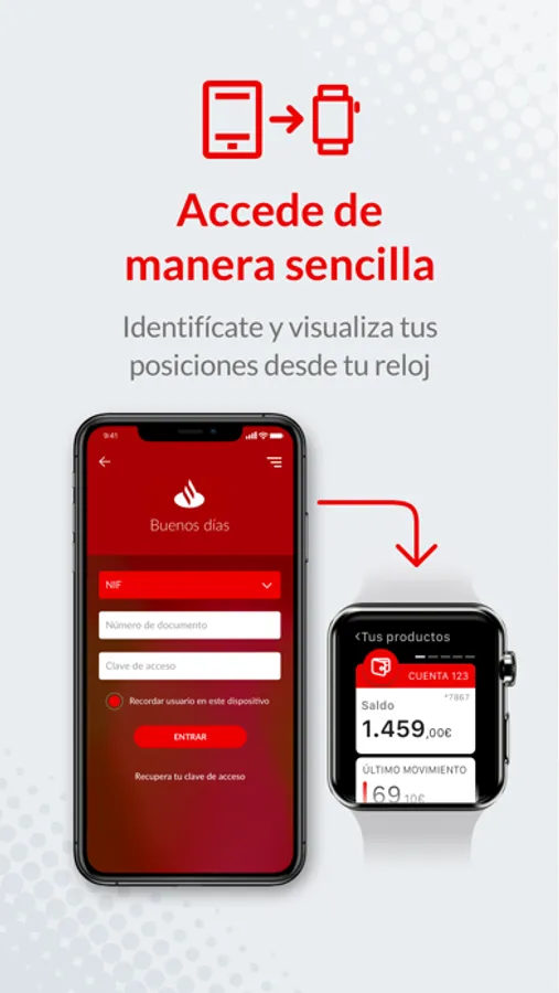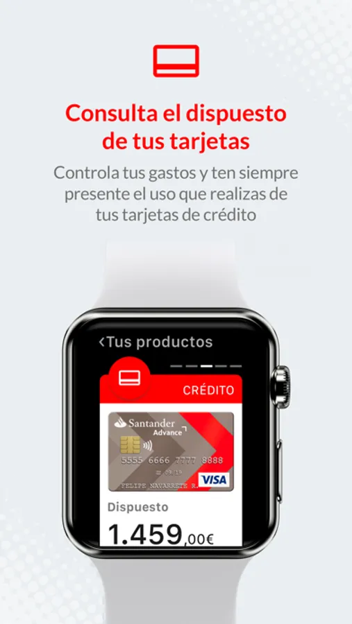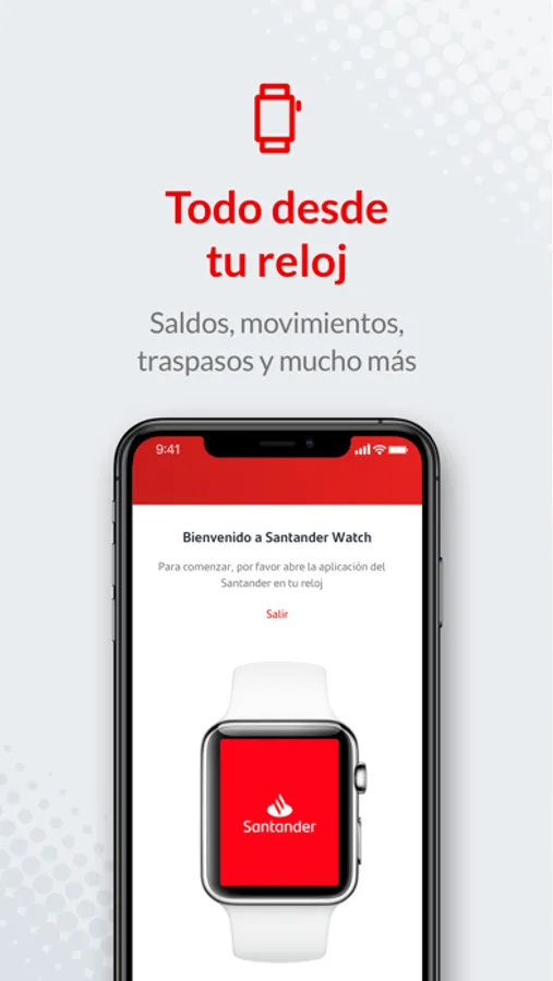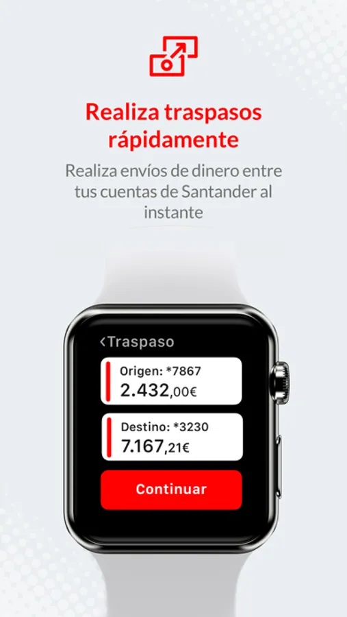 Utiliza la App Santander también desde tu muñeca. Tu banco abierto las 24h del día los 365 días al año. Con un diseño renovado, mejor usabilidad y ahora con novedades en funcionalidad. Puedes realizar: