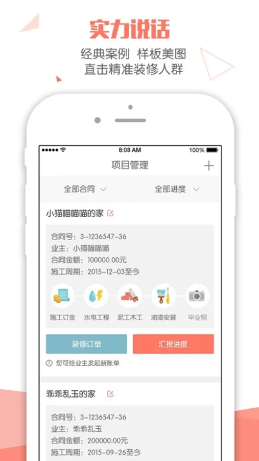 2.【项目管理】实现远程汇报装修进度,让更多业主在装修圈看到您的案例。