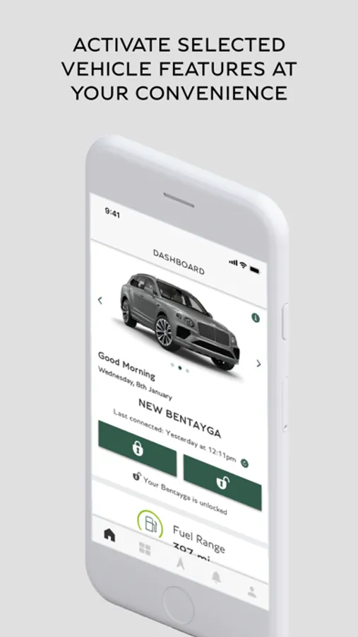 • Whether it is access to real time information about your vehicle, observing your vehicle’s past activity, or the peace of mind to check and lock your vehicle remotely, the My Bentley App provides you with access to a wide range of driver enhancing services.