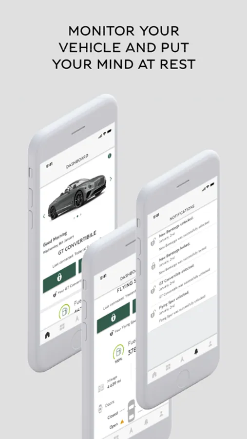 • Put your mind at rest in the knowledge that you can observe your Bentley’s location and be notified of any triggered alarms from the comfort of the My Bentley App.