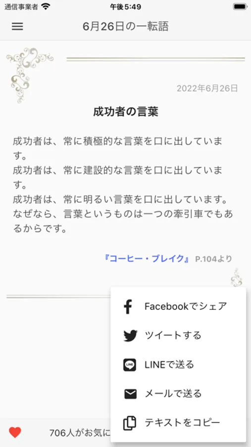 お気に入りの言葉を、LINE、Facebook、Twitter、メールでそのまま転送できます。