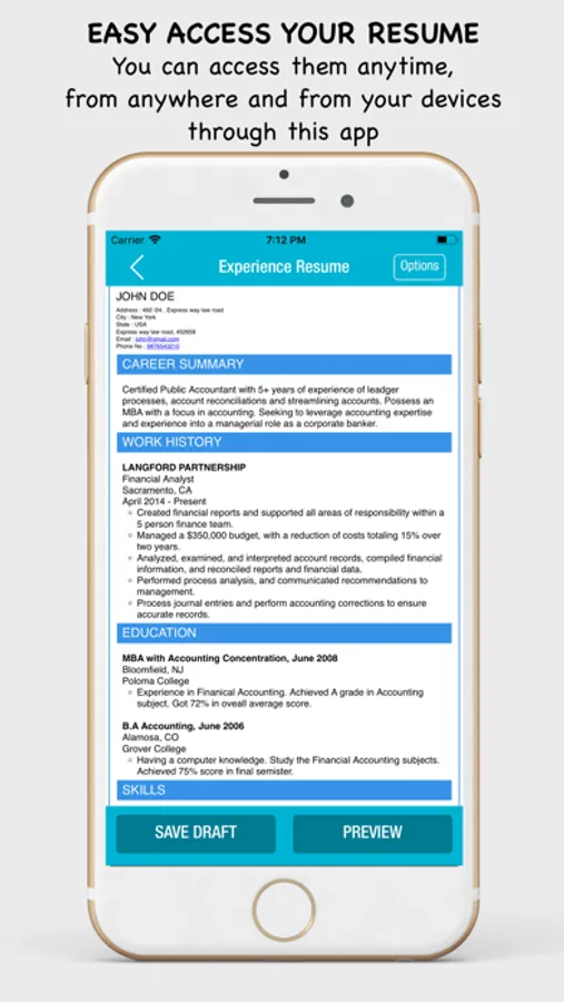 First choose your resume template design which is pre-written with examples. From resume template directly tap or click on the particular section which you want to edit like contact information, objective, educations, work experience, skills and other sections directly. After editing your information save it, which generate your resume in PDF format. After generating the PDF, the application allows the user to preview the resume to confirm and then share your resume to prospective employers through mail as attachment.