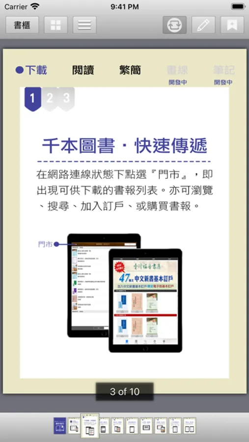 在網路連線的狀態下點選『門市』,即出現可供下載的書報列表。亦可瀏覽、搜尋或加入訂戶。在『下載書報』頁面,點選欲下載書報的封面,隨即出現簡介視窗。然後點選『下載書報』按鈕,即可下載該本書報。下載完成的電子書會自動會出現在書櫃中。點選書櫃中的任何一本書報,便可開啟電子書隨處閱讀。