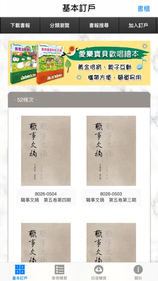 APP內購買基本訂戶採一年一個梯次,每個梯次內容不同,49梯次為最新一個梯次(與48梯次不同),發書時間為2017年七月中旬至2018年六月。 豫計陸續發行之中文新書、職事文摘約有十餘本、晨興聖言九本,總計超過二十多本書報,涵括近百篇信息。購買後,請至本APP門市的『下載書報』頁面下載相關書報。