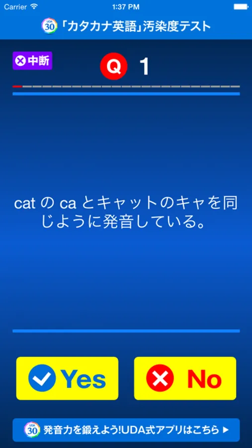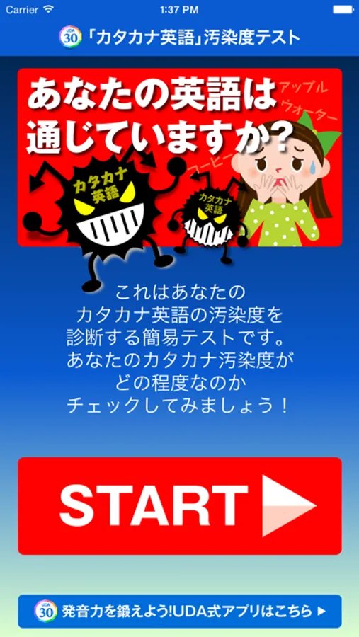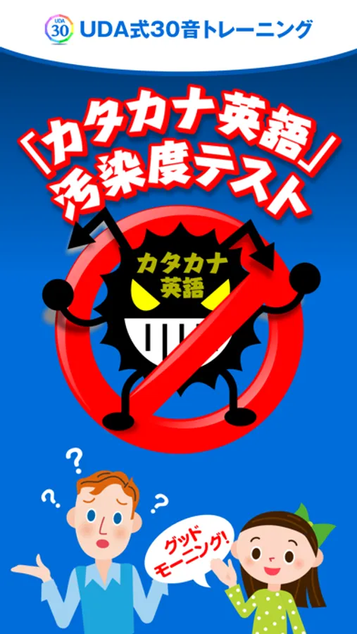 「カタカナ英語汚染度テスト」は、UDA式の公式ホームページ「30音でマスターする英会話」に公開されているオンライン教材のうち、特に人気の高い「カタカナ汚染度診断テスト」をアプリとして再構成したものです。