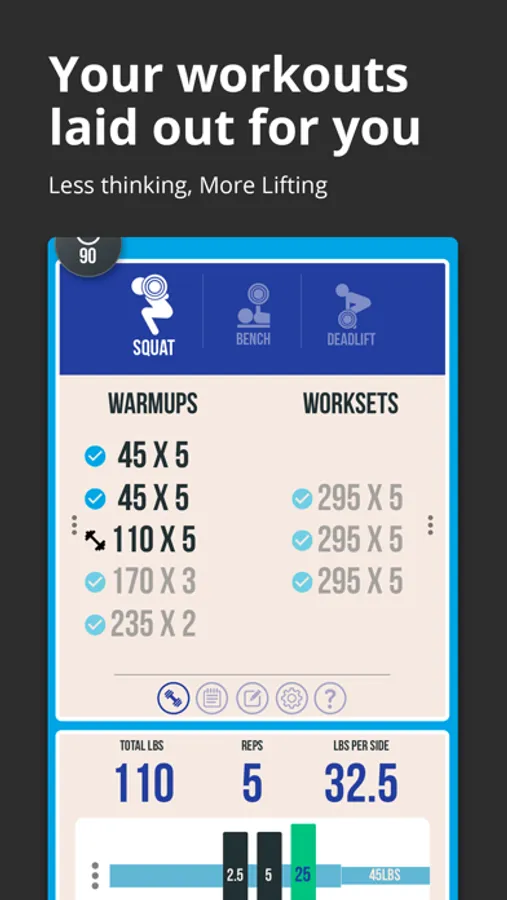 - Warmup and workset calculator shows you exactly how many plates to put on each side of the bar.