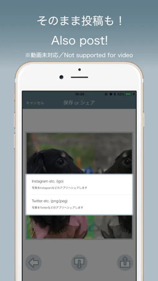 Since the created image is processed into a square so that it can be easily posted to Instagram, it can be posted to the Instagram as it is, in addition to saving it to the camera roll.