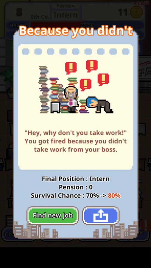 ‘Don’t get fired!’, is a survival game where you get to play a character who has no money, no connections whatsoever. You need to make him climb up the company ladder from an ‘intern’ to the ‘president’.
