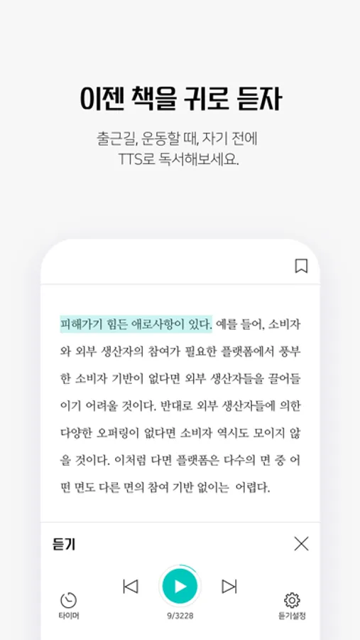 - 타이머 기능으로 원하는 시간, 듣고 싶은 페이지까지 예약 가능