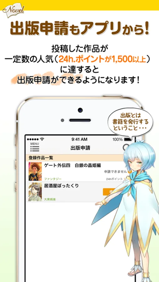 投稿した作品が一定数の人気(24h.ポイントが1,500以上)に達すると出版申請ができるようになります!