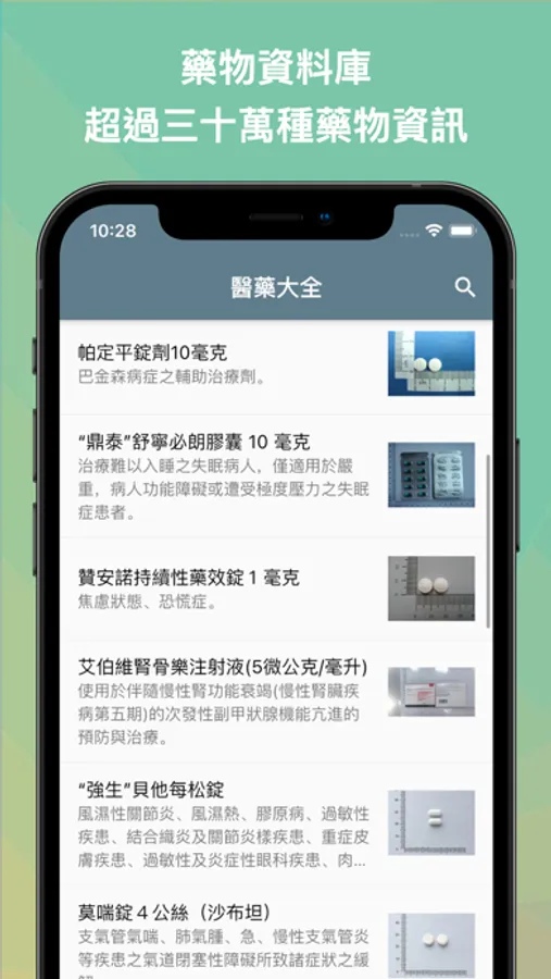 《醫藥大全》APP提供您詳細的藥品資訊(常見用藥、藥物成分、適應症、藥物外觀、藥物圖片、用法用量、用藥須知、藥廠資訊、仿單)