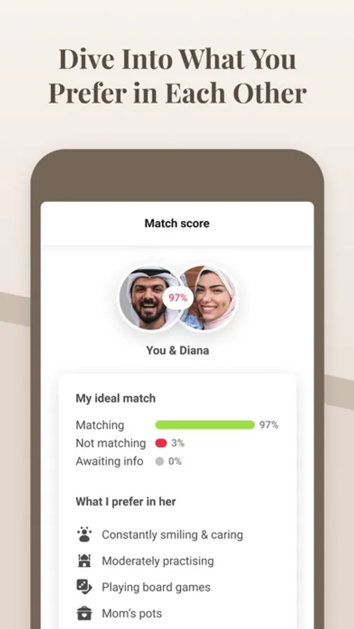 Soudfa is created based on 12 years of international experience in the development of halal taarof platforms and matching algorithms. We take everything into account except the looks