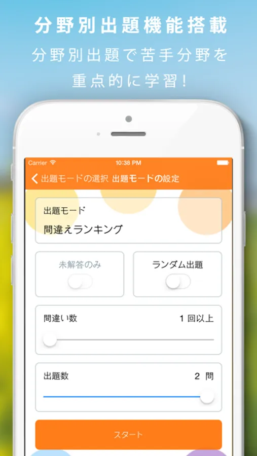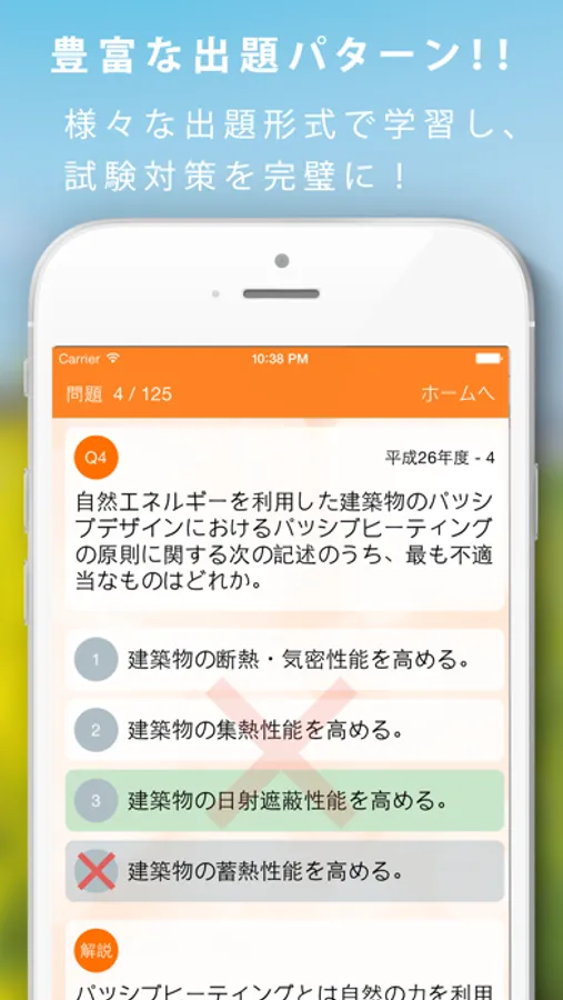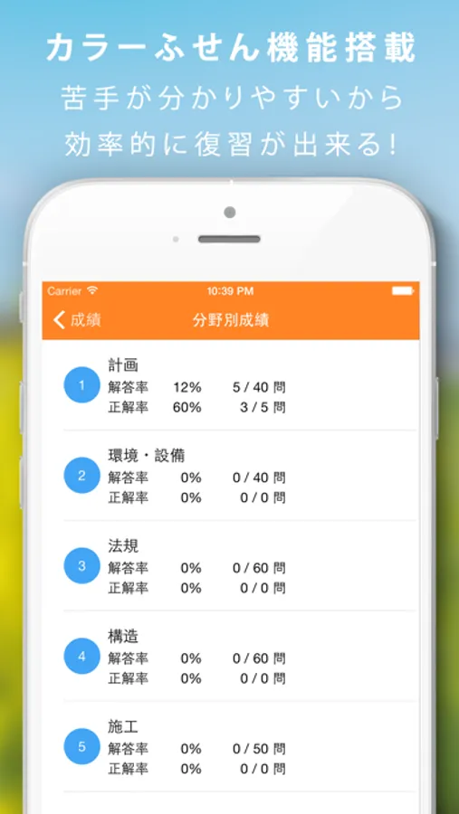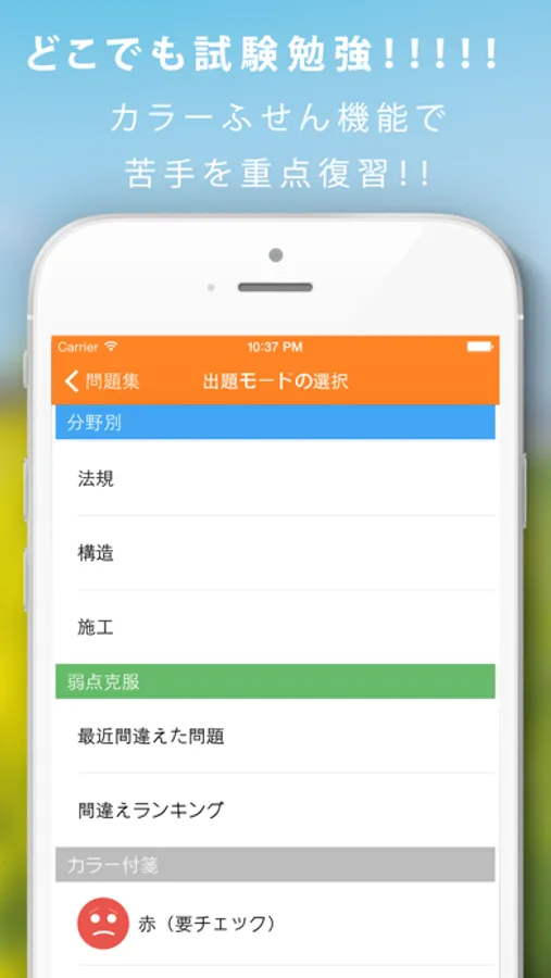 開催別、分野別、苦手な問題などから独自の問題セットを作成することができ重要な項目を徹底的に勉強できます。復習用にカラー付箋(ふせん)を使用したり、間違い回数が多い問題だけを解けるのでスキマ時間に、いつでも、どこでも効率的な学習が可能です。成績機能も充実しており、解答率、正解率、分野ごとの分析されます。