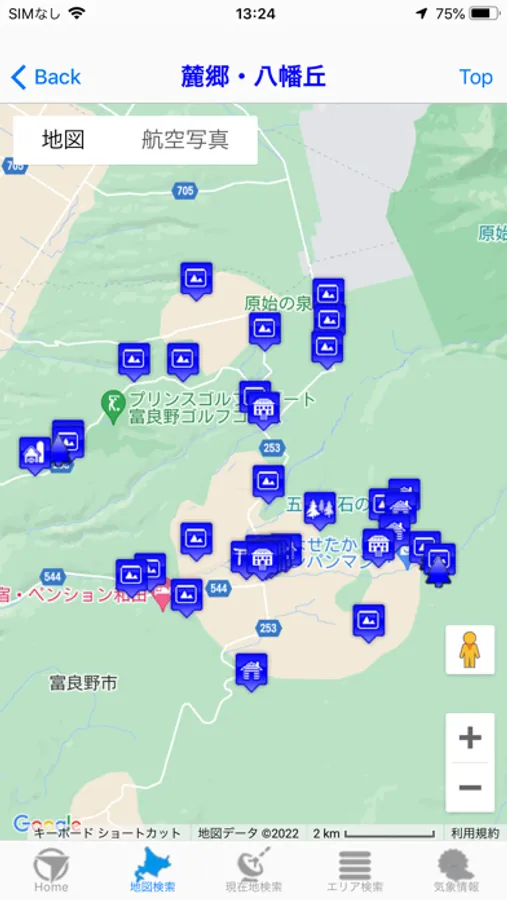 地図からビューポイントを検索します。地図上のアイコンは、「麓郷・八幡丘」が青、「富良野市街地」が赤、「北の峰・御料」が緑、「布部・山部」がオレンジ、「中富良野方面」が紫で表示されます。地図上のアイコンをタップすると、ビューポイント名が表示されますので、そこをタップするとビューポイント情報が表示されます。