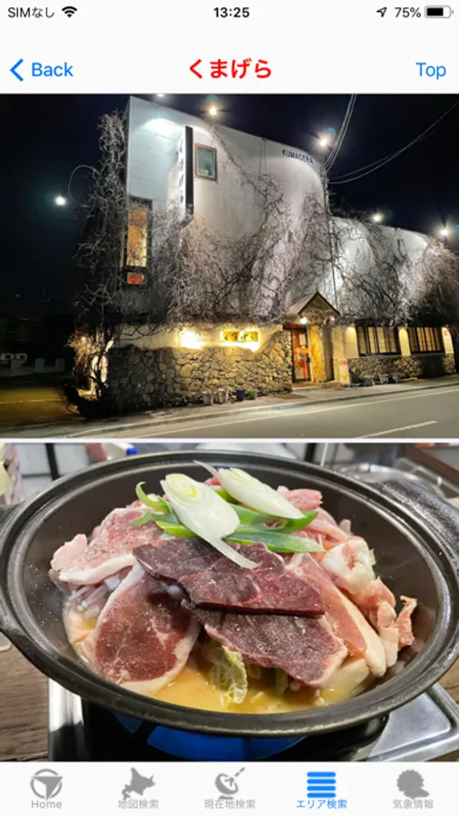 写真とともに住所、マップコード、簡単なコメントを表示します。ボタンが「ビューポイントMAP」と表示されている場合、そこをタップすると表示されている写真を実際に撮影した場所が航空写真で表示されます。ボタンが「被写体名称 MAP(例:「五郎の石の家MAP」等)」と表示されている場合、そこをタップすると被写体の場所が航空写真で表示されます。また、「現在地からのルートMAP」をタップすると、地図上にルートが表示されるととともに、地図上のアイコンをタップすると、「現在地からの直線距離」と「ルート上の移動距離」が吹き出し表示されます。また、「NaviConへ送る」をタップすると、株式会社デンソーのアプリNaviConを利用してカーナビに地点を送信できます。