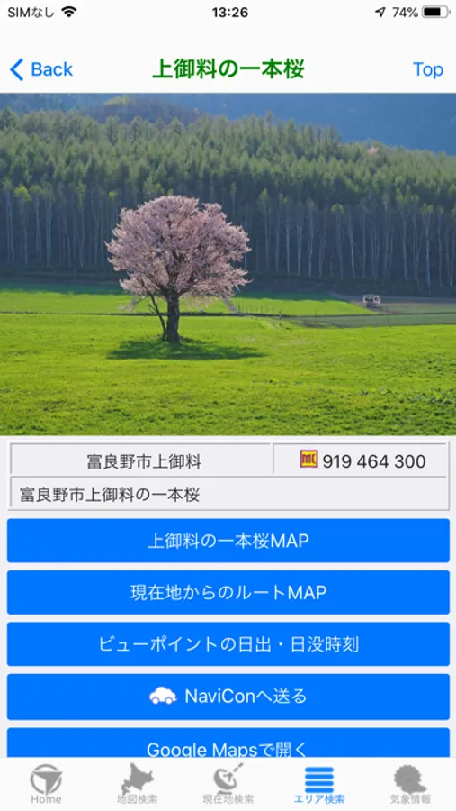 「麓郷・八幡丘」「富良野市街地」「北の峰・御料」「布部・山部」「中富良野方面」の5つのエリア毎にビューポイント名を一覧表示します。ビューポイント名をタップすると、ビューポイント情報が表示されます。