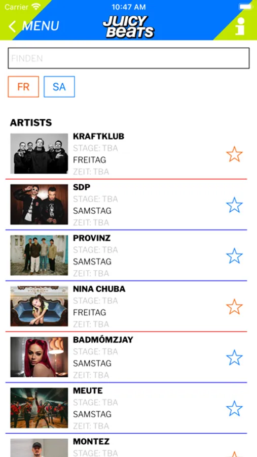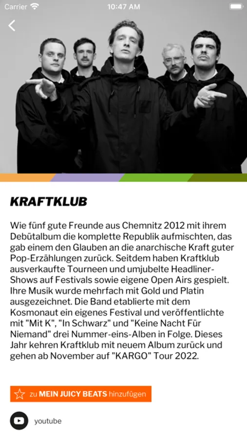 Die App zum Juicy Beats Festival – euer perfekter Begleiter in der Hosentasche. Hier findet ihr neben dem Timetable auch Texte, Bilder und Videos zu allen Künstlern. Mit der praktischen Karte inklusive Standortbestimmung findet ihr euch im Park zurecht und behaltet den Überblick über die Stages und Floors. Im `Mein Juicy Beats‘-Bereich könnt ihr außerdem eure Favoriten zusammenstellen und seht auf einen Blick, wer wann wo spielt!
