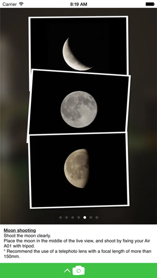 Place the moon in the middle of the live view, and shoot by fixing your Air A01 with tripod.