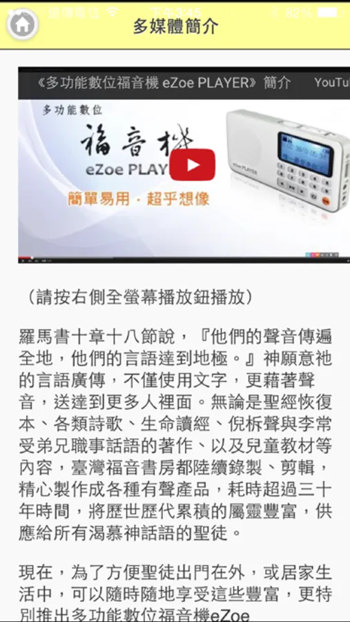 福音機小幫手(eZoe PLAYER Helper)是一個由臺灣福音書房所開發的免費下載的APP,專為iPhone智慧手機、iPad平板電腦設計。本APP收錄多功能數位福音機(eZoe PLAYER)16GB進階版、8GB普及版的使用手冊,包含簡介說明、包裝內容、操作使用、保固說明、目錄索引等相關資訊。亦整合常見問答(紙本印刷手冊未收錄)、線上客服等功能。正如歌羅西書三章十六節所說,『當用各樣的智慧,讓基督的話豐豐富富的住在你們裏面,用詩章、頌辭、靈歌,彼此教導,互相勸戒,心被恩感歌頌神。』。盼望此APP的推出,能提供福音機使用者隨身的輔助,也作為行動客服、技術諮詢更佳便捷的管道,幫助大家利用零碎時間隨身聆聽屬靈的說話,得著滋養、贖回光陰。