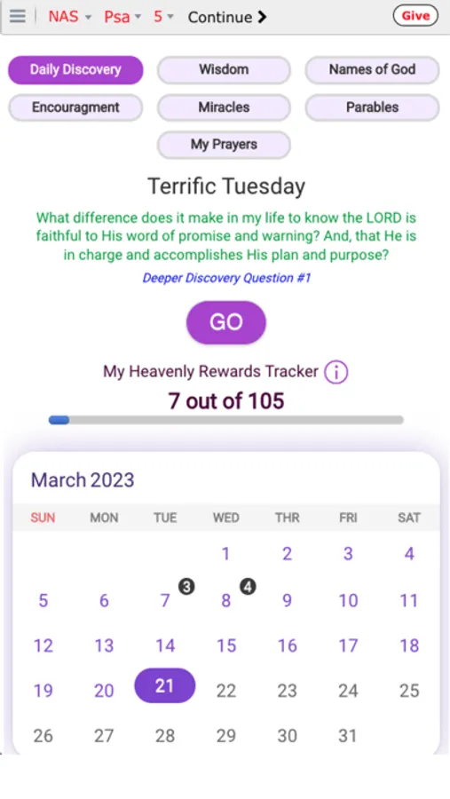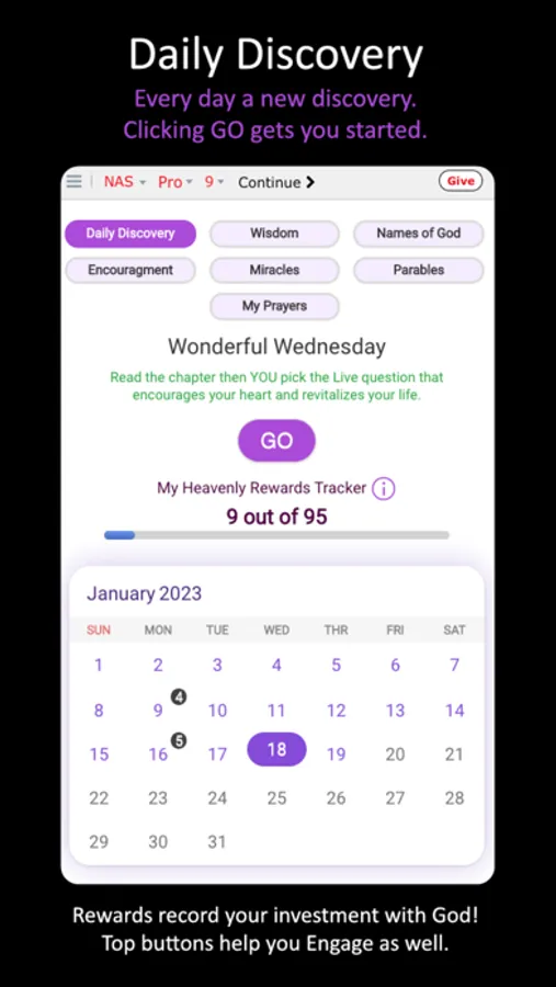- A “Daily Discovery” – hits your device with a life changing invitation that will engage and encourage you. Complete with your own ‘Heavenly Reward’ scorecard Tracker.
