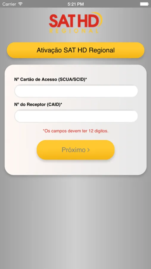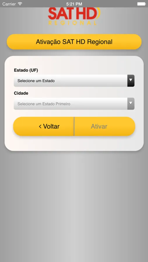 The App allows the final viewer, the installer and/or the seller to activate an official SAT HD Regional set top box, after the correct installation in the TV and the satellite dish. The user must fill the CAID field (set top box number), SCUA/SCID field (smartcard number) and indicate which city and State the set top box is installed. After a few minutes, the right feed (Regional or National) will be available to the final viewer.