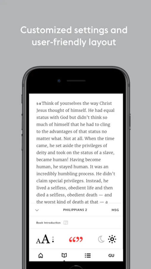 - Settings for font size, preferred Bible translation, red letter function, and dark mode